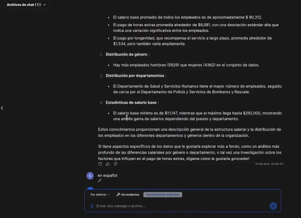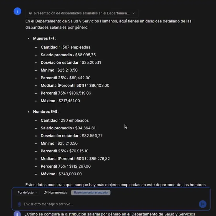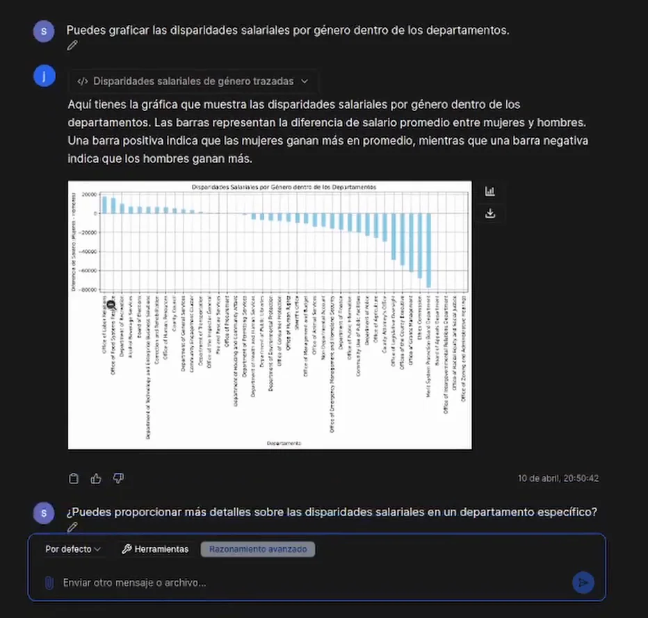Julius AI no solo se limita al análisis numérico; también permite la creación de gráficos. Los usuarios pueden solicitar gráficos que representen disparidades salariales por género dentro de cada departamento. Esta visualización ayuda a comprender mejor los datos y a identificar patrones que podrían no ser evidentes en una tabla de números.
