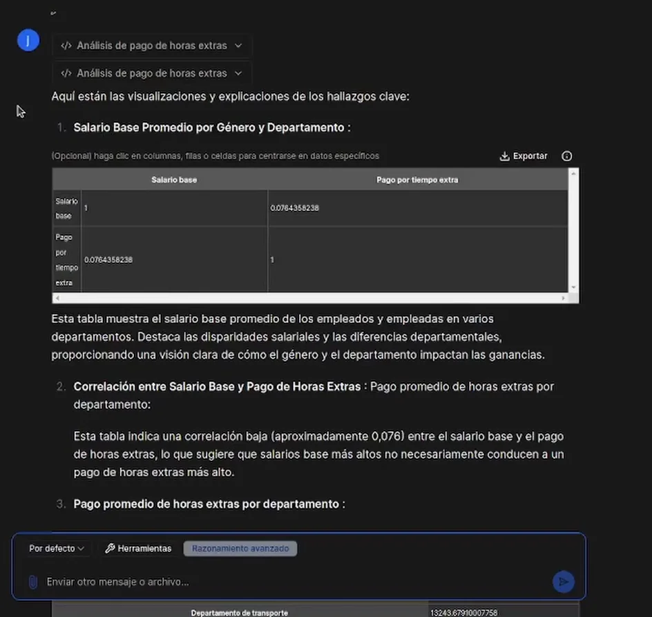 Una de las funcionalidades destacadas de Julius AI es la capacidad de analizar el pago de horas extra. Los usuarios pueden solicitar un análisis específico sobre este tema y obtener información detallada sobre el promedio de horas extra trabajadas por departamento.